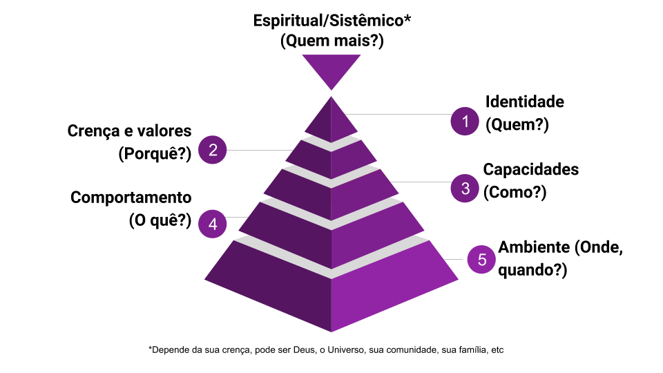 Para explorarmos um pouco mais sobre os valores pessoais, selecionei a pirâmide de níveis neurológicos da PNL, criada por Robert Dilts e Todd Epstein. Nesta hierarquia, os níveis superiores influenciam diretamente os níveis inferiores, gerando impactos diretos nos resultados das pessoas, sejam eles positivos ou negativos.