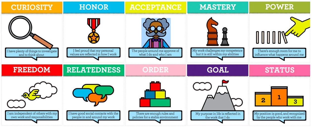 Mas eu ainda sentia que estava faltando alguma coisa… Embora ela seja muito boa, foca apenas em 10 motivadores e não abarca a complexidade de sentimentos e valores humanos. Além disso, o seu enfoque é mais voltado ao ambiente de trabalho.